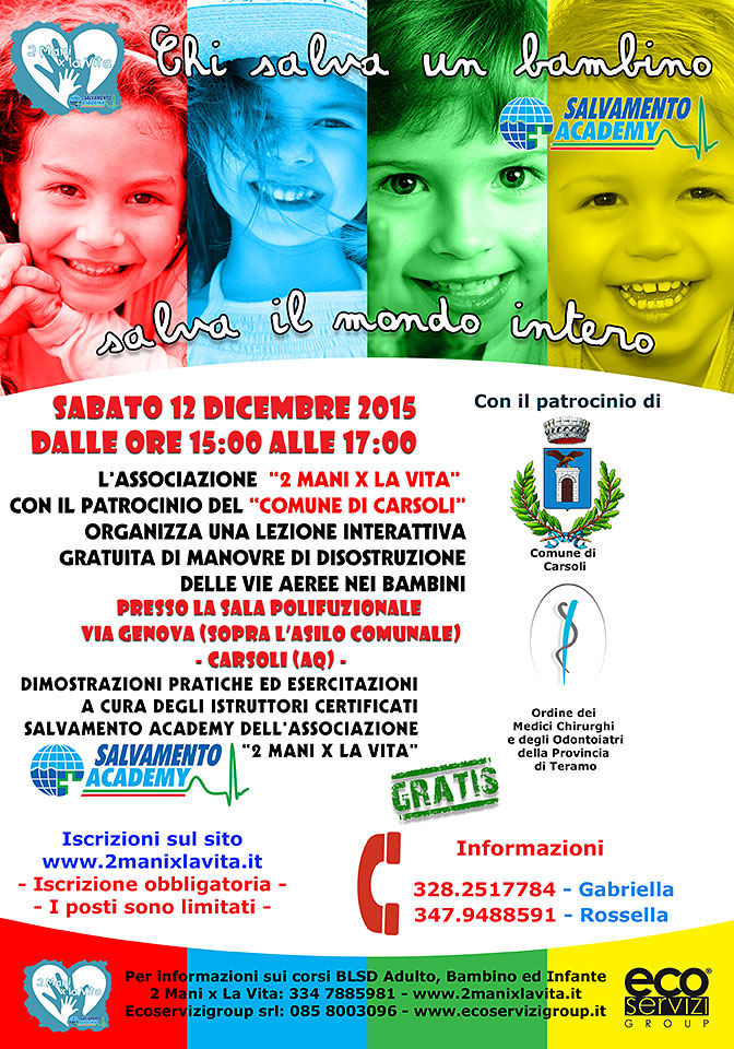 L'associazione "2 Mani x La Vita" con il patrocinio del comune di Carsoli e dell'ordine dei Medici Chirurghi e degli Odontoiatri della provincia di Teramo organizza una: