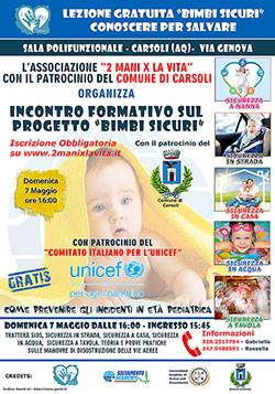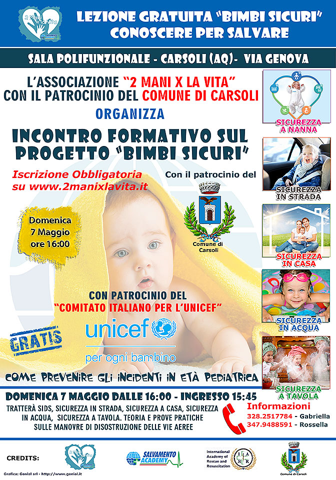 Tratterà di SIDS, sicurezza in strada, sicurezza a casa, sicurezza in acqua, sicurezza a tavola. Teoria e prove pratiche sulle manovre di disostruzione delle vie aeree.I