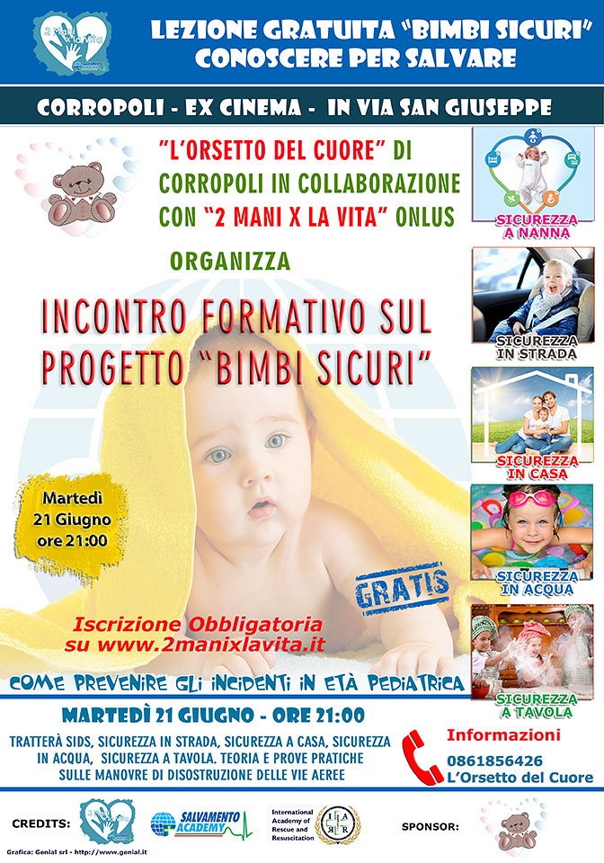 Tratterà di SIDS, sicurezza in strada, sicurezza a casa, sicurezza in acqua, sicurezza a tavola. Teoria e prove pratiche sulle manovre di disostruzione delle vie aeree.