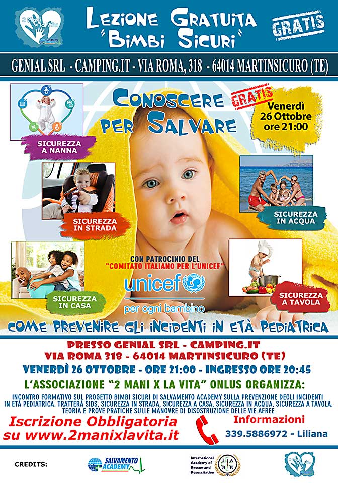 Tratterà di SIDS, sicurezza in strada, sicurezza a casa, sicurezza in acqua, sicurezza a tavola. Teoria e prove pratiche sulle manovre di disostruzione delle vie aeree.I