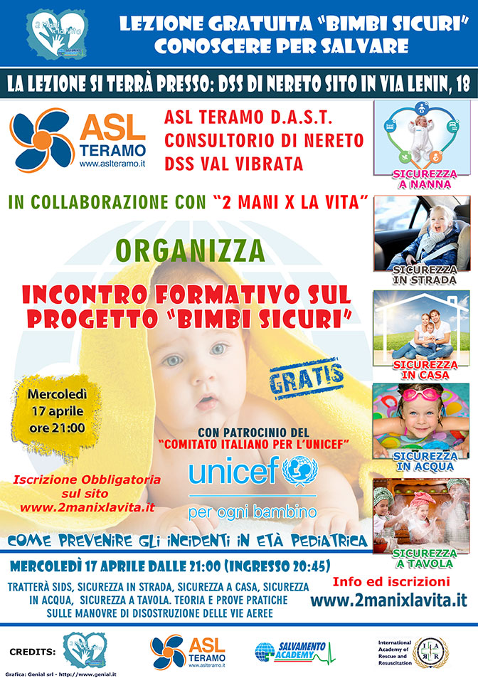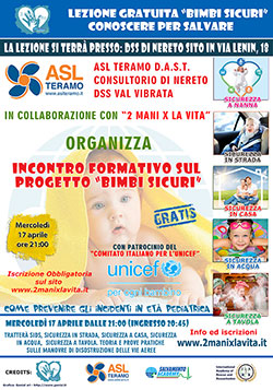 Tratterà di SIDS, sicurezza in strada, sicurezza a casa, sicurezza in acqua, sicurezza a tavola. Teoria e prove pratiche sulle manovre di disostruzione delle vie aeree.I