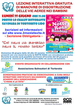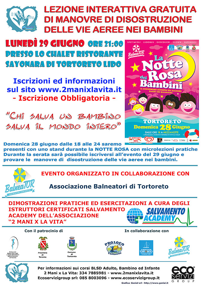 L'evento è organizzato nel contesto della Notte Rosa dedicata ai bambini che si terrà domenica 28 giugno. 2 Mani x La Vita sarà presente con un proprio stand anche il giorno 28 giugno.